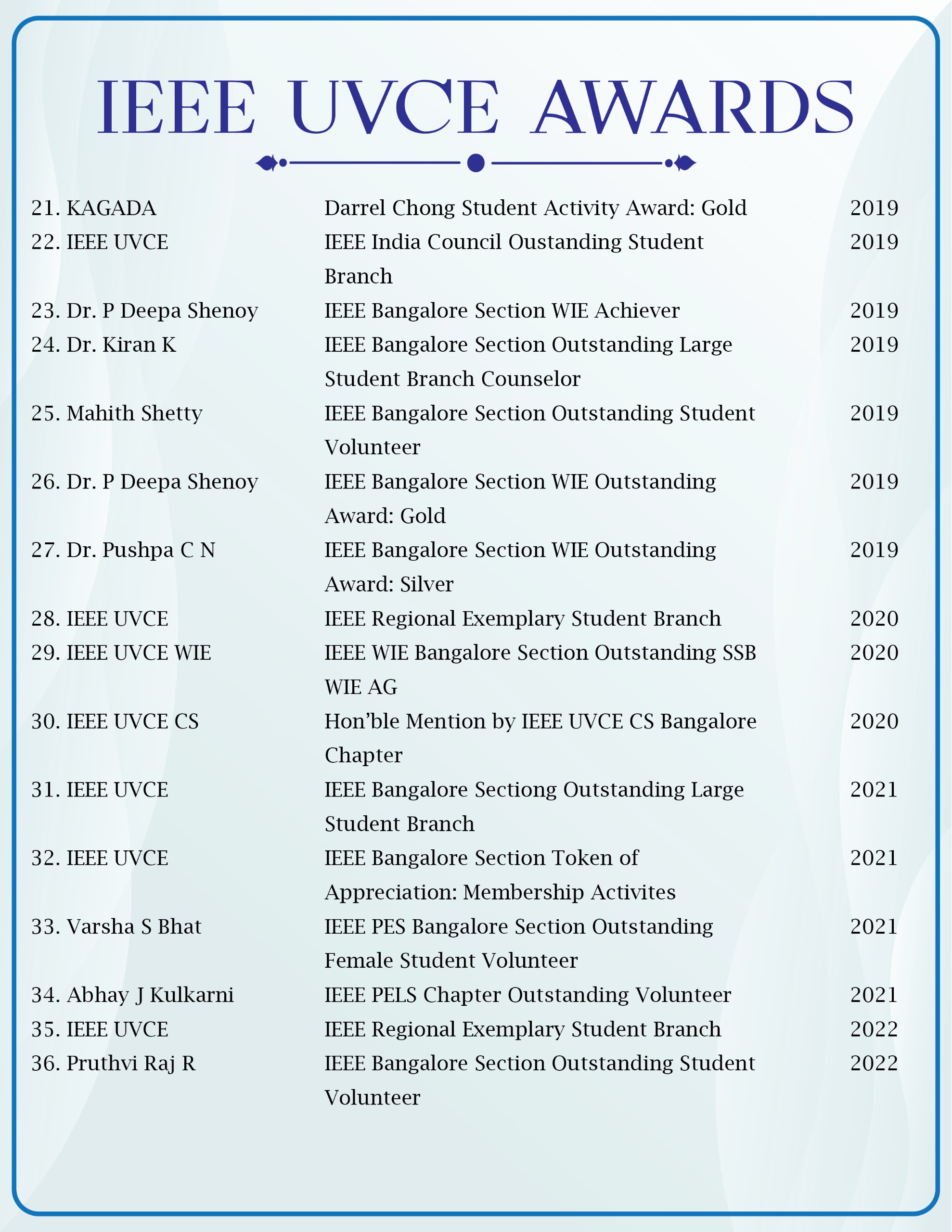 The IEEE UVCE Rewards Program is a comprehensive system created to recognize and reward active participation in IEEE UVCE events. Points are allocated based on the specific events attended, allowing members to accumulate points over time. A student from each branch receives exciting goodies for their active participation. This program not only helps participants track their involvement in IEEE activities but also provides a tangible way to acknowledge their ongoing commitment and engagement. As members continue to participate, their points grow, reflecting their active role within the IEEE community.